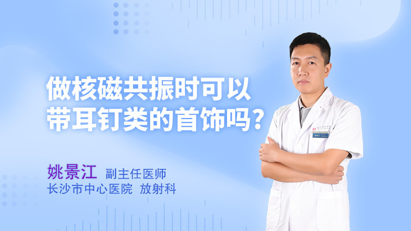 核磁共振也叫磁共振,英文简称为MRI,是利用人体中的氢质子核来成像。磁共振机器好比一个大磁体,把人放进去之后,发射无线电波,关掉无线电波后,人体发出信号,该信号被接收,用来计算出人体不同组织的图像。做核磁共振检查的时候,是不能佩戴耳钉类的首饰的,在进入核磁共振检查室之前,应该去除身上带的手机、磁卡、手表、钥匙、打火机、金属皮带、金属项链、金属耳环等物件,否则,检查时可能影响磁场的均匀性,造成图像的干扰,形成伪影,十分不利于病灶的显示;而且由于强磁场的作用,金属物品可能被吸进核磁共振机,从而对非常昂贵的核磁共振扫描仪造成破坏。