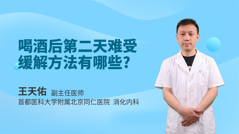 喝酒后第二天难受主要是因为酒精的刺激引起来的一些症状,包括刺激胃黏膜和神经系统,一般来说第二天要吃一些软的、好消化的食物,也可以喝一些奶制品,牛奶类的这些食物,来保护胃黏膜。如果症状比较明显的情况,可以用一些抑制胃酸的药物,包括奥美拉唑或者雷贝拉唑,或者泮托拉唑等等,任选一种,或者用H2受体拮抗剂,比方说法莫替丁等,并加上胃黏膜的保护剂,比方说铝碳酸镁等这些保护黏膜的药物。