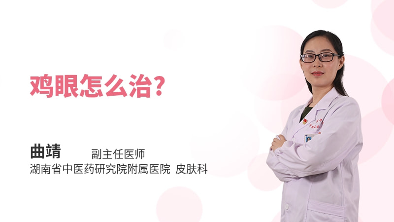 治疗鸡眼的方法有外用腐蚀剂、物理治疗、手术切除。 外用腐蚀剂是用鸡眼膏外贴或鸡眼软膏外敷,外用腐蚀剂会导致周围皮肤破溃,不是非常提倡。 物理治疗是采用电离子或二氧化碳激光烧灼,去除圆锥形角质栓,或采用浅层 X 线照射,此外冷冻等方法也可适用。