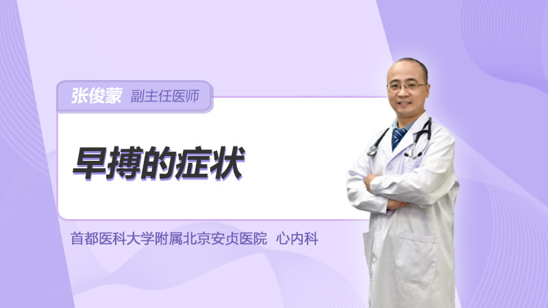 早搏最常见的症状就是心悸感,因为它打乱了正常的节律,还有一部分患者不典型的会表现为胸闷,还有心前区的不适,除了这之外,早搏的症状还跟是不是合并其他疾病有关系,比如甲亢合并的早搏,可能伴随甲亢的相关症状,比如心绞痛,也有一部分患者早搏是没有任何症状的。